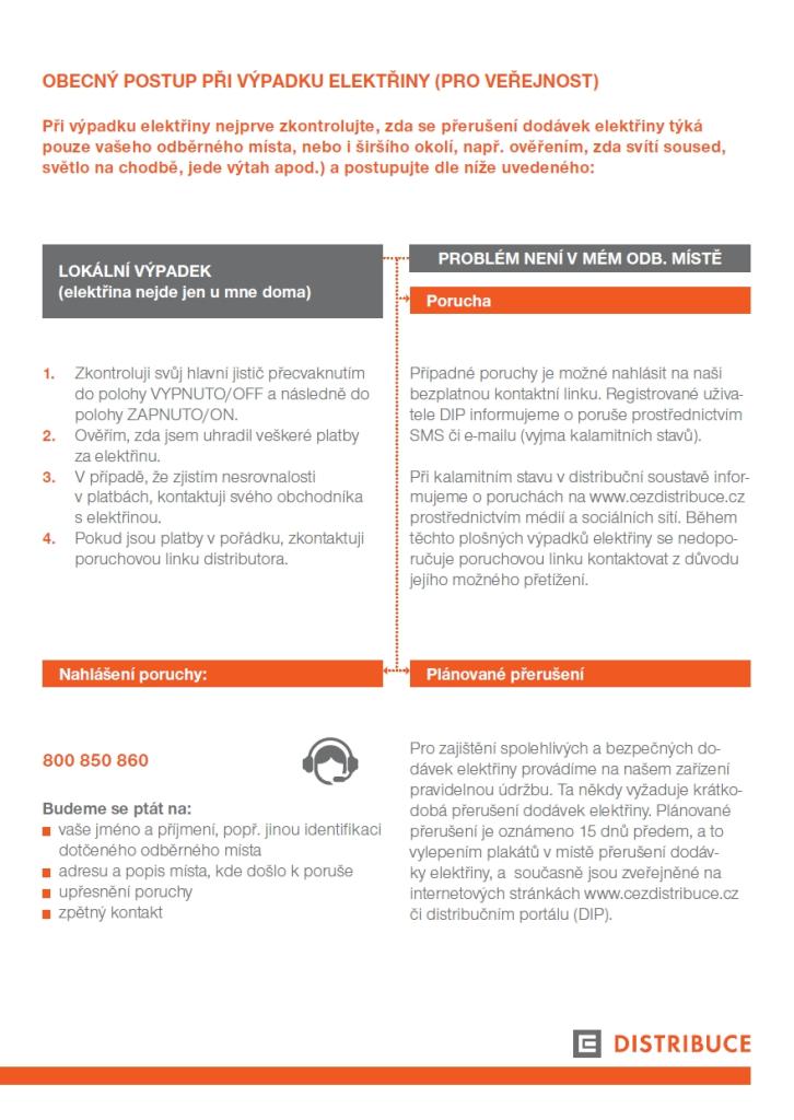 Při výpadku elektřiny nejprve zkontrolujte, zda se přerušení dodávek elektřiny týká pouze vašeho odběrného místa, nebo i širšího okolí, např. ověřením, zda svítí soused, světlo na chodbě, jede výtah apod.) a postupujte dle níže uvedeného: