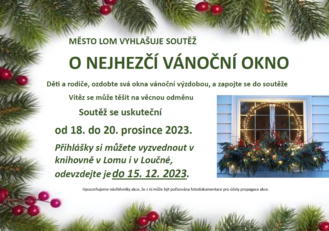Do 15. prosince můžete vyplnit přihlášku do soutěže "O nejhezčí vánoční okno" - přihlášky jsou k dispozici v knihovně Lom i Loučná.