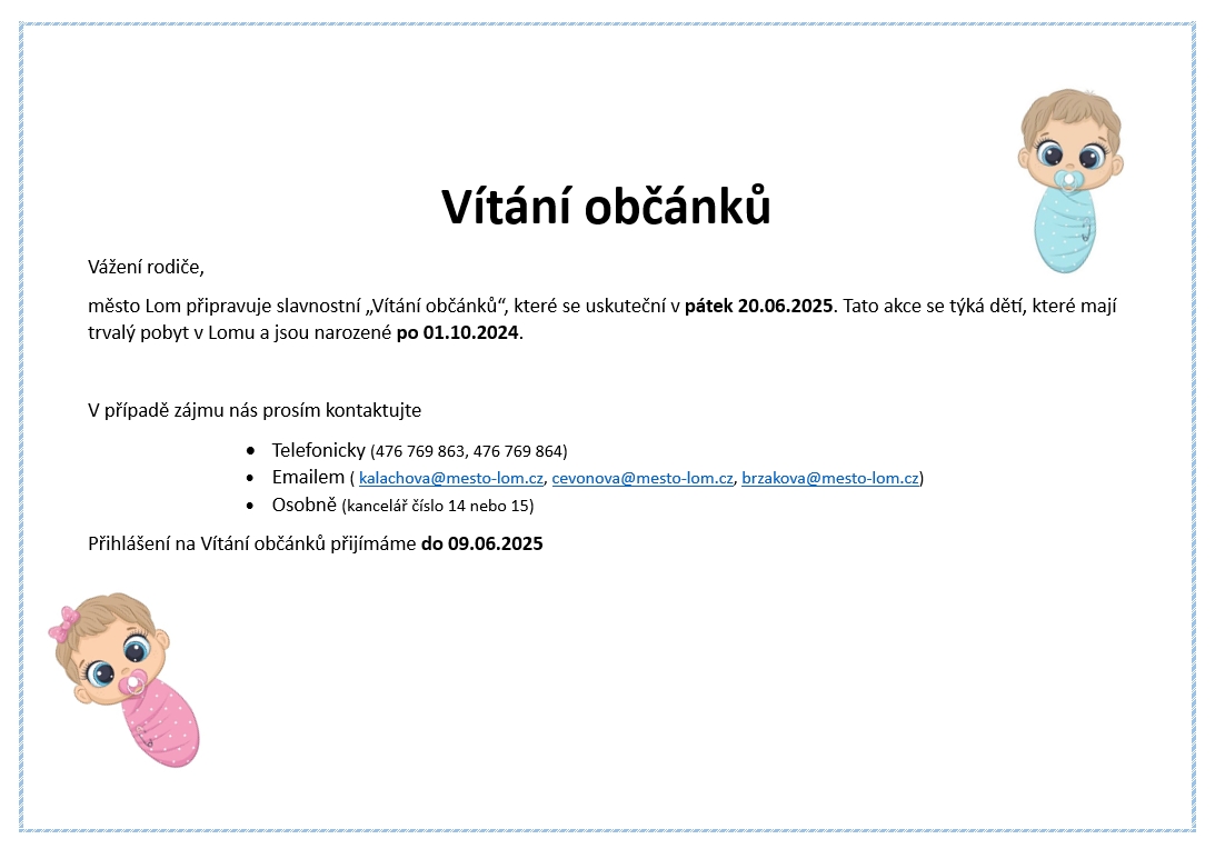 Přihlášení na Vítání občánků přijímáme do 09.06.2025