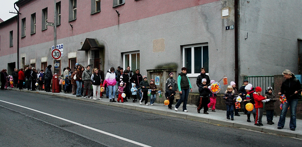Když se přiblížila čtvrtá hodina a začali jsme se scházet na dvoře školky, bylo jasné, že nás k velké radosti všech bude opravdu hodně. Děti s rodiči, ale také sourozenci, babičky, dědečkové a ostatní členové rodiny… nikdo si nenechal akci ujít. Po rozsvícení lampionů všech barev, tvarů a velikostí jsme vyrazili na obchůzku města . Rodiče i učitelky měli navíc další možnost se vzájemně více poznat a popovídat si. Děti zářily štěstím víc, než svíčky v lampionech. V průběhu cesty jsme udělali krátkou zastávku na hřišti, děti všem přítomným zazpívaly písničku a odrecitovaly básničku. Navzdory chladnému počasí se nám povedlo ujít pěkný kus cesty a při postupném rozcházení bylo slyšet slova chvály. Děkujeme za příjemný zážitek a těšíme se na další společnou akci.