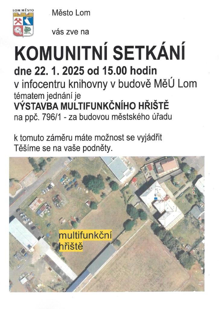 Město Lom pořádá komunitní setkání, které se bude konat 22. ledna 2025 od 15:00 v infocentru knihovny v budově městského úřadu. Tématem jednání je plánovaná výstavba multifunkčního hřiště na pozemku 796/1 za budovou úřadu. Obyvatelé města jsou zváni, aby se vyjádřili k tomuto záměru a přispěli svými podněty.